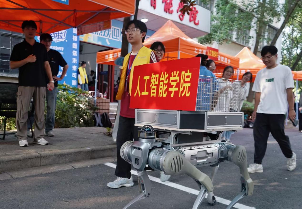 人工智能学院创新引入机器狗“小智”运送行李服务与机器人R2展示。机器狗“小智”高效协助新生搬运行李,吸引众多新生及家长驻足观看。上下楼梯、规避识别障碍物、负重运输,一系列操作让新同学们直观感受前沿科技带来的无穷魅力。
