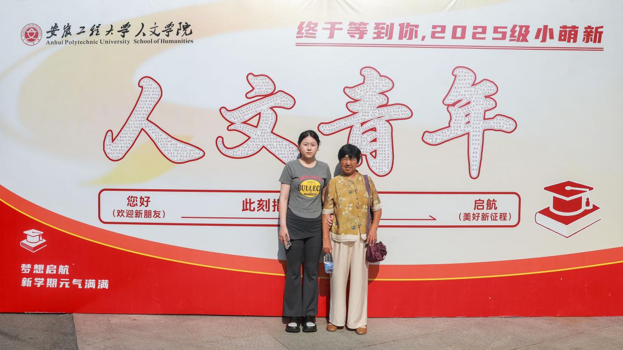 人文学院迎新现场,背景中“人文青年”字样是由所有新生的名字精心缀连而成,将个体微光凝聚成集体的温暖符号;墙面之上,小柿子寄托“万事胜意”的祈愿,小苹果承载“平安喜乐”的祝福,每一件都是给新生的专属密语,织就满墙的温暖与期盼。