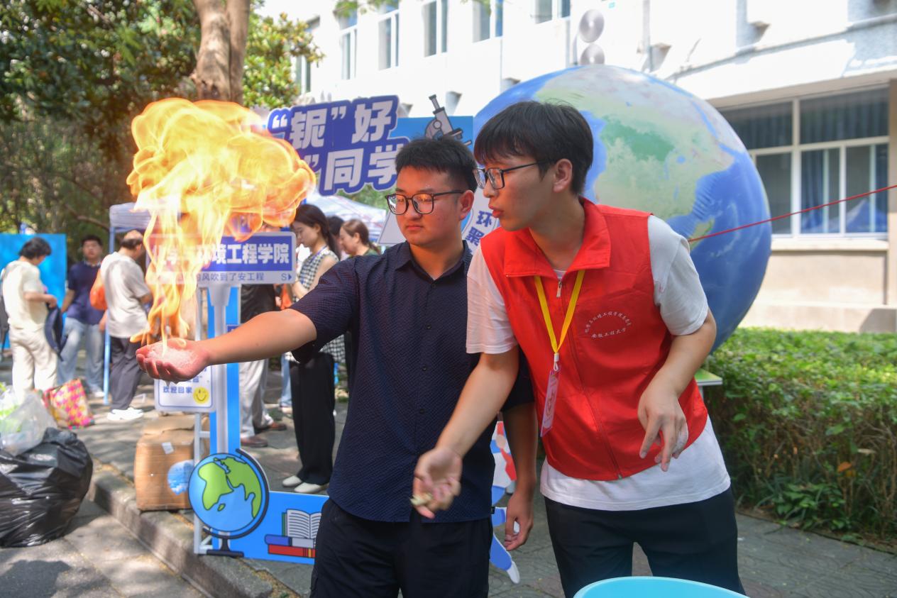 化学与环境工程学院巨型环保地球气球凌空而起,承载绿色使命;横幅上元素周期表灵动排列,勾勒化学之美。学院精心准备暖心之礼和趣味化学小实验“火焰掌”,以化学式的浪漫,启航求知新程。